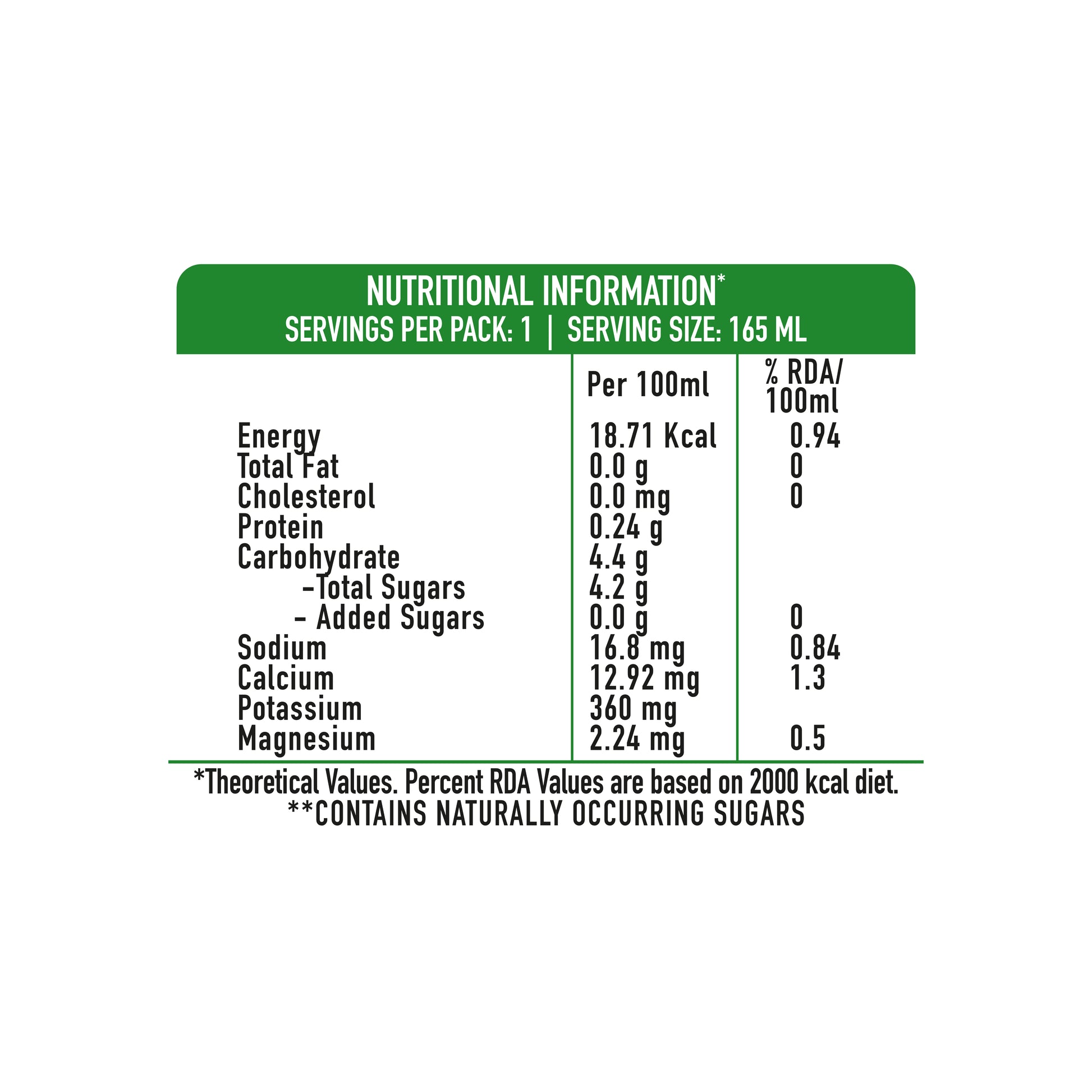 🥥 100% Tender Coconut Water – Made from fresh, tender coconuts with no added sugar, no concentrate, and zero chemical preservatives (except natural bio-preservative).
